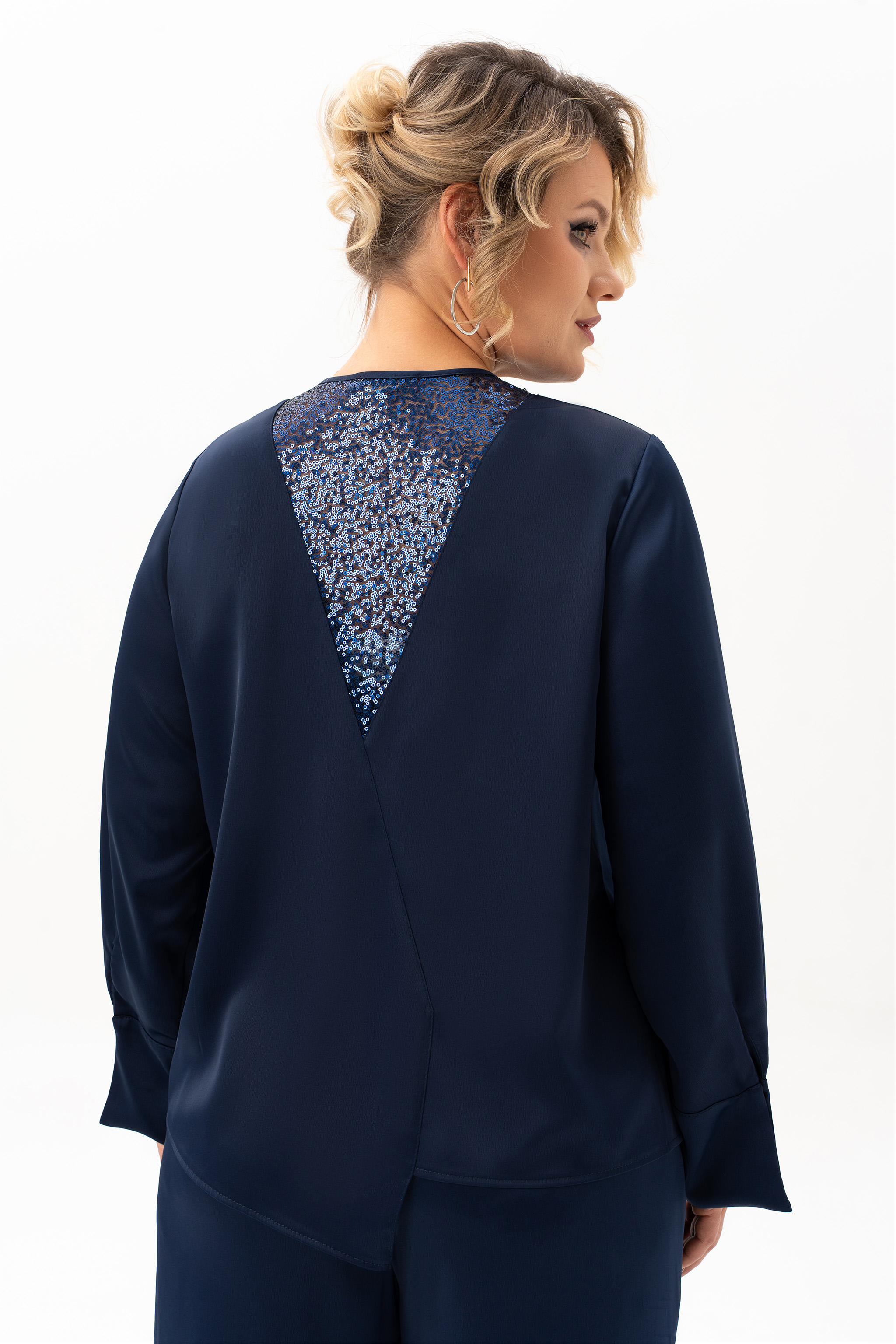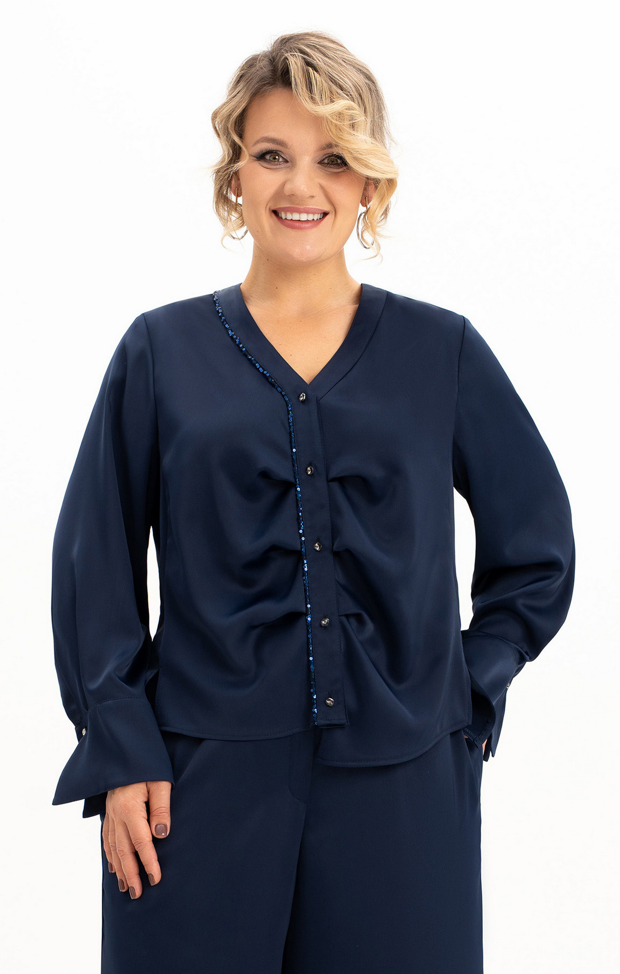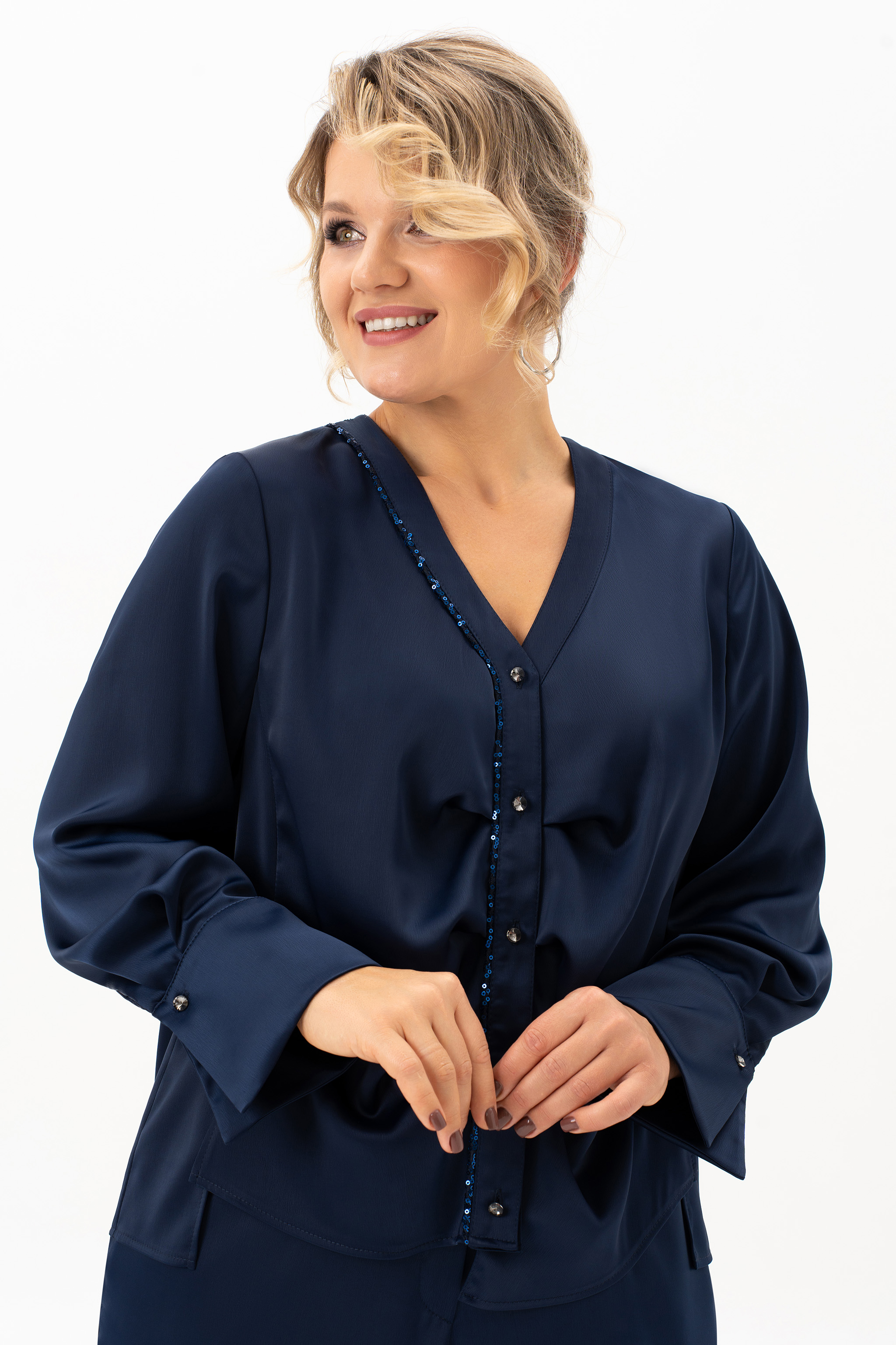 Нарядно- повседневевя , элегантная  женская блузка  — настоящая находка для тех, кто ищет идеальный образ на праздник, свадьбу или важный вечер. Безупречно смотрится на большом мероприятии, создавая образ, полный уверенности и шарма. Блуза выполнена из шелковистой ткани с приятной фактурой. Блузка с длинными струящимися рукавами выглядит очень изящно и очаровательно. Блузка без воротника, застежка на петли и пуговицы по планке, с V – образным вырезом горловины. Спинка с декоративным элементом из паеток. По переду вдоль планок заложены складки и обработан кант из паеток. Изделие  асимметрично  по низу. Боковые швы перенесены в линию рельфа полочки и спинки. В рельефах полочки обработаны разрезы. Рукав со складкой по шву притачивания манжеты. Прямого силуэта с втачным , длинным рукавом. С данной блузой можно создать  красивый костюм или комплект  строгого силуэта — идеальное сочетание для торжеств и даже для делового офисного дресс кода. Подходит для женщин больших и полных размеров, продуманный крой визуально стройнит, подчёркивает талию и скрывает лишнее. Создайте идеальный образ — выберите блузу от "Альгранда" и подчеркните свою индивидуальность!