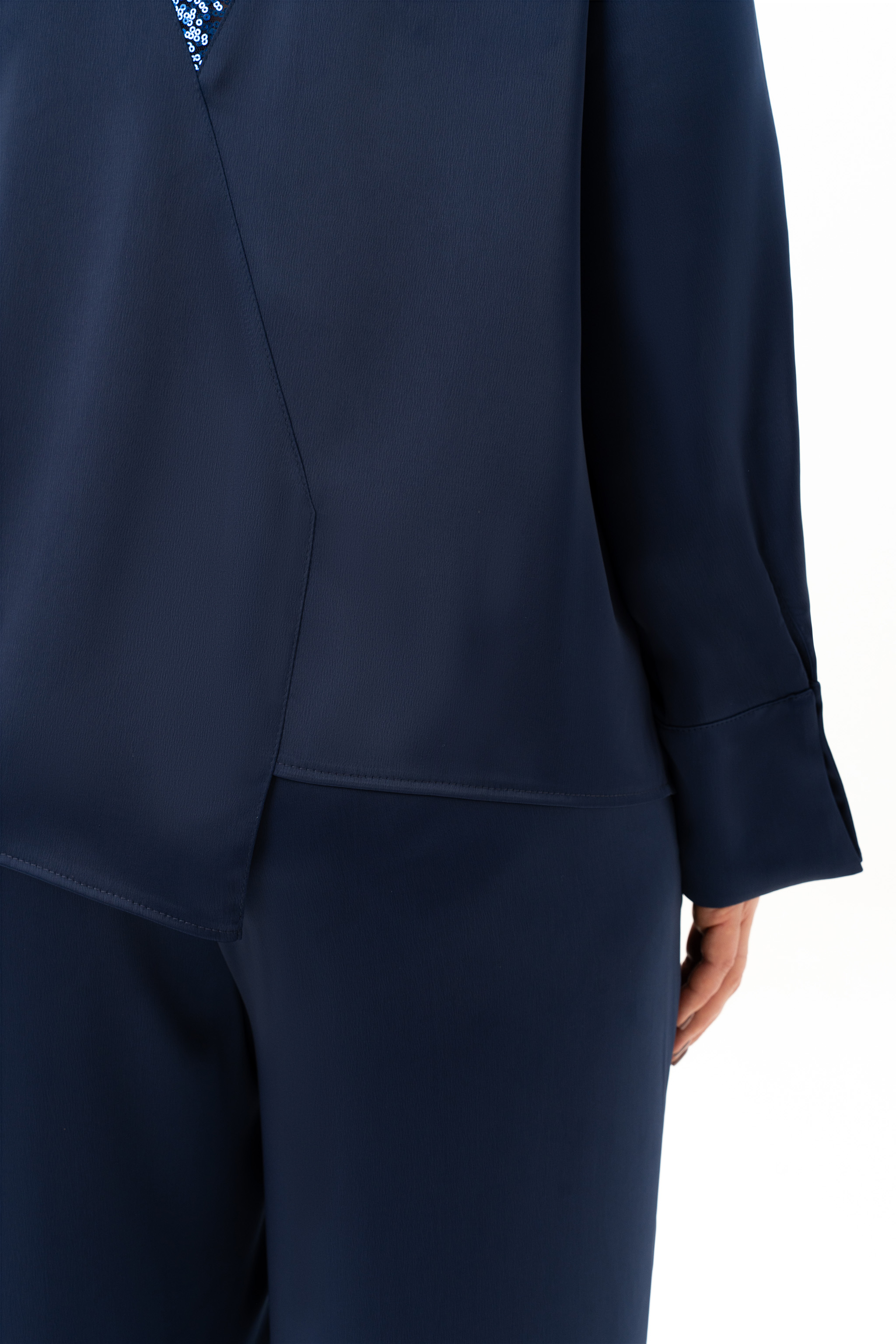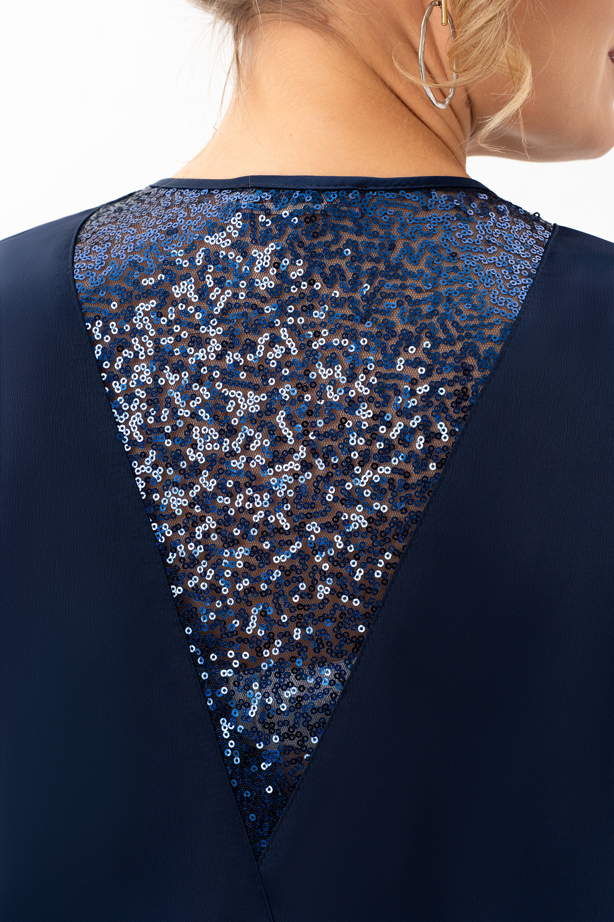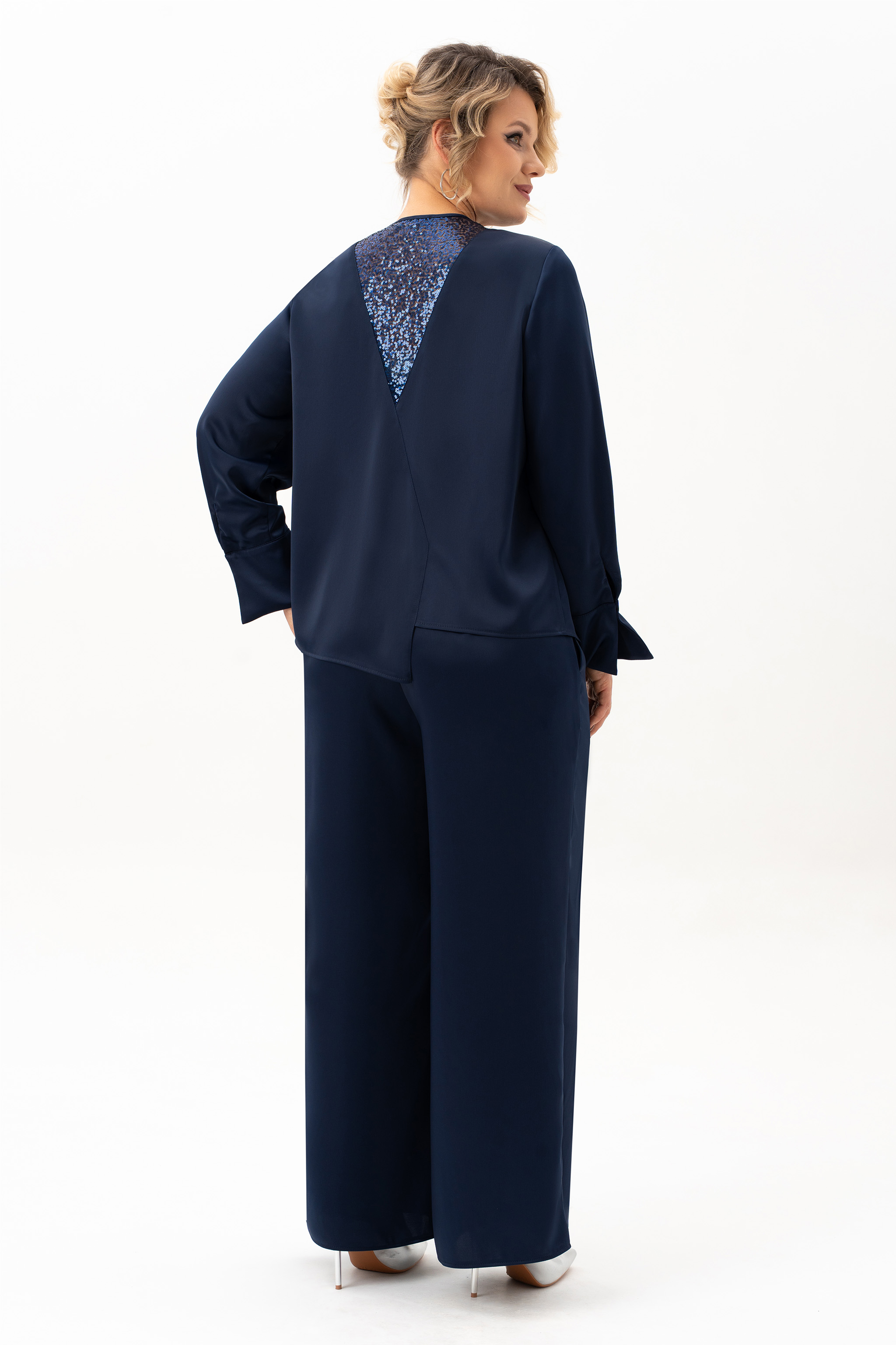Нарядно- повседневевя , элегантная  женская блузка  — настоящая находка для тех, кто ищет идеальный образ на праздник, свадьбу или важный вечер. Безупречно смотрится на большом мероприятии, создавая образ, полный уверенности и шарма. Блуза выполнена из шелковистой ткани с приятной фактурой. Блузка с длинными струящимися рукавами выглядит очень изящно и очаровательно. Блузка без воротника, застежка на петли и пуговицы по планке, с V – образным вырезом горловины. Спинка с декоративным элементом из паеток. По переду вдоль планок заложены складки и обработан кант из паеток. Изделие  асимметрично  по низу. Боковые швы перенесены в линию рельфа полочки и спинки. В рельефах полочки обработаны разрезы. Рукав со складкой по шву притачивания манжеты. Прямого силуэта с втачным , длинным рукавом. С данной блузой можно создать  красивый костюм или комплект  строгого силуэта — идеальное сочетание для торжеств и даже для делового офисного дресс кода. Подходит для женщин больших и полных размеров, продуманный крой визуально стройнит, подчёркивает талию и скрывает лишнее. Создайте идеальный образ — выберите блузу от "Альгранда" и подчеркните свою индивидуальность!