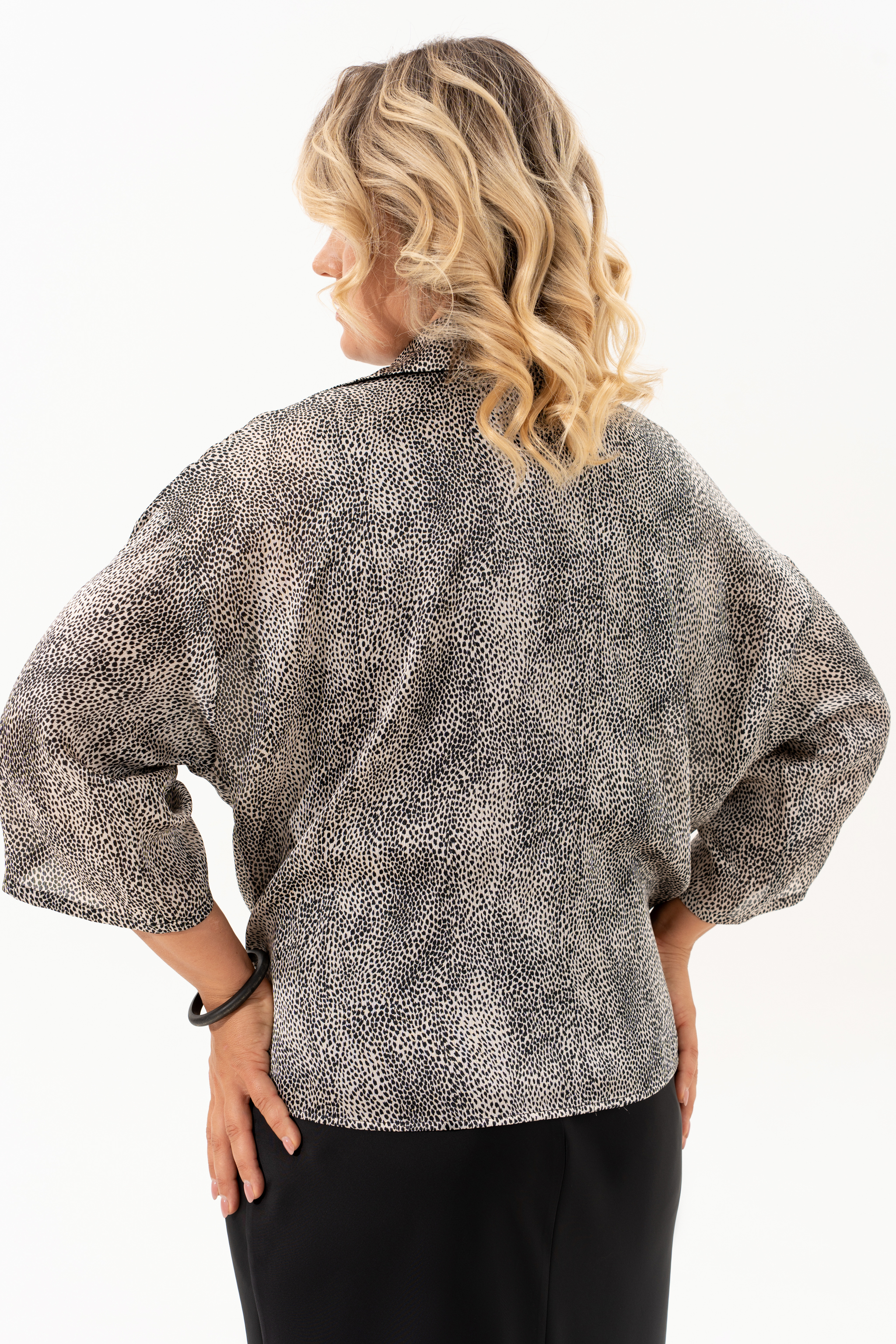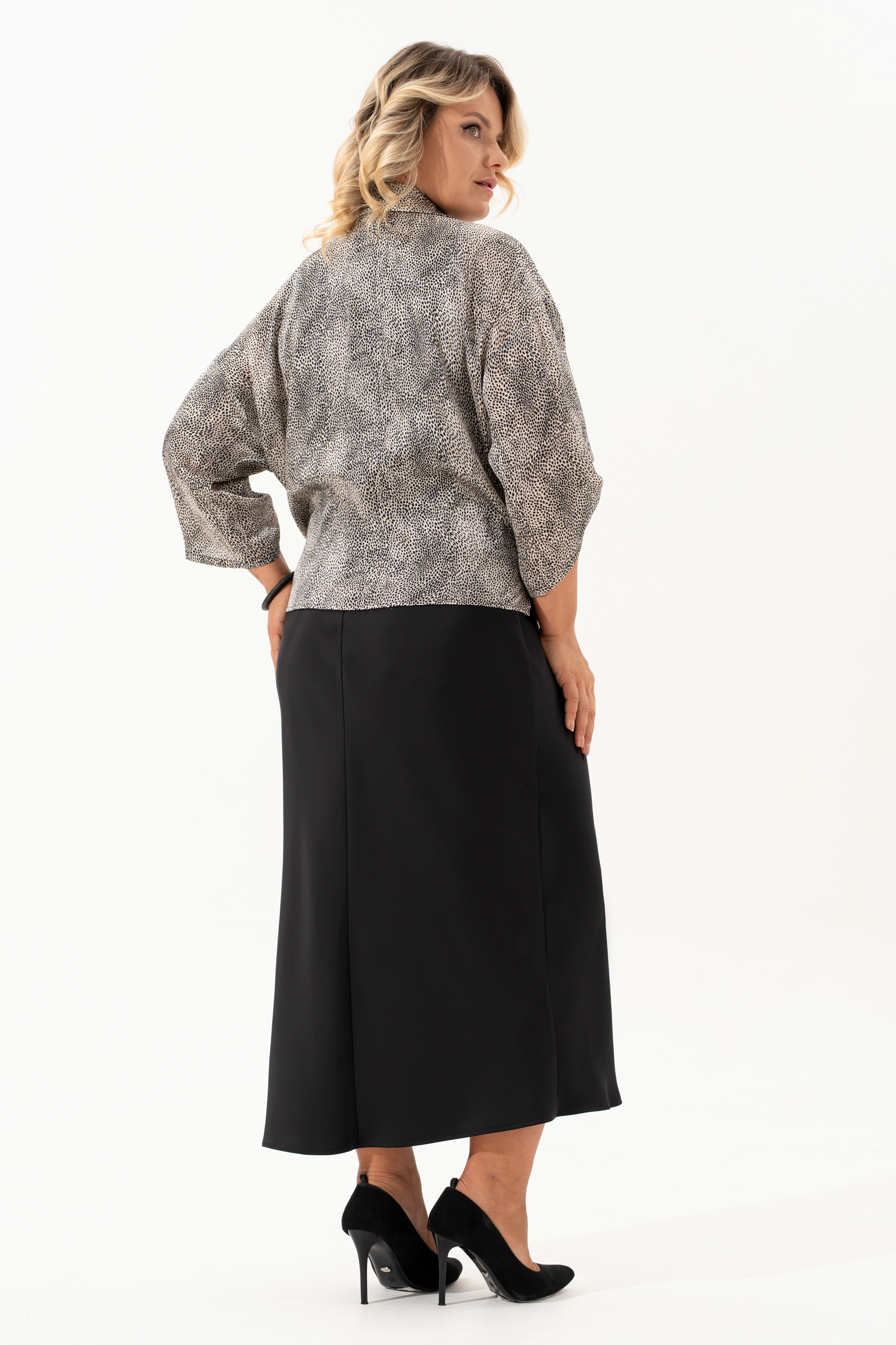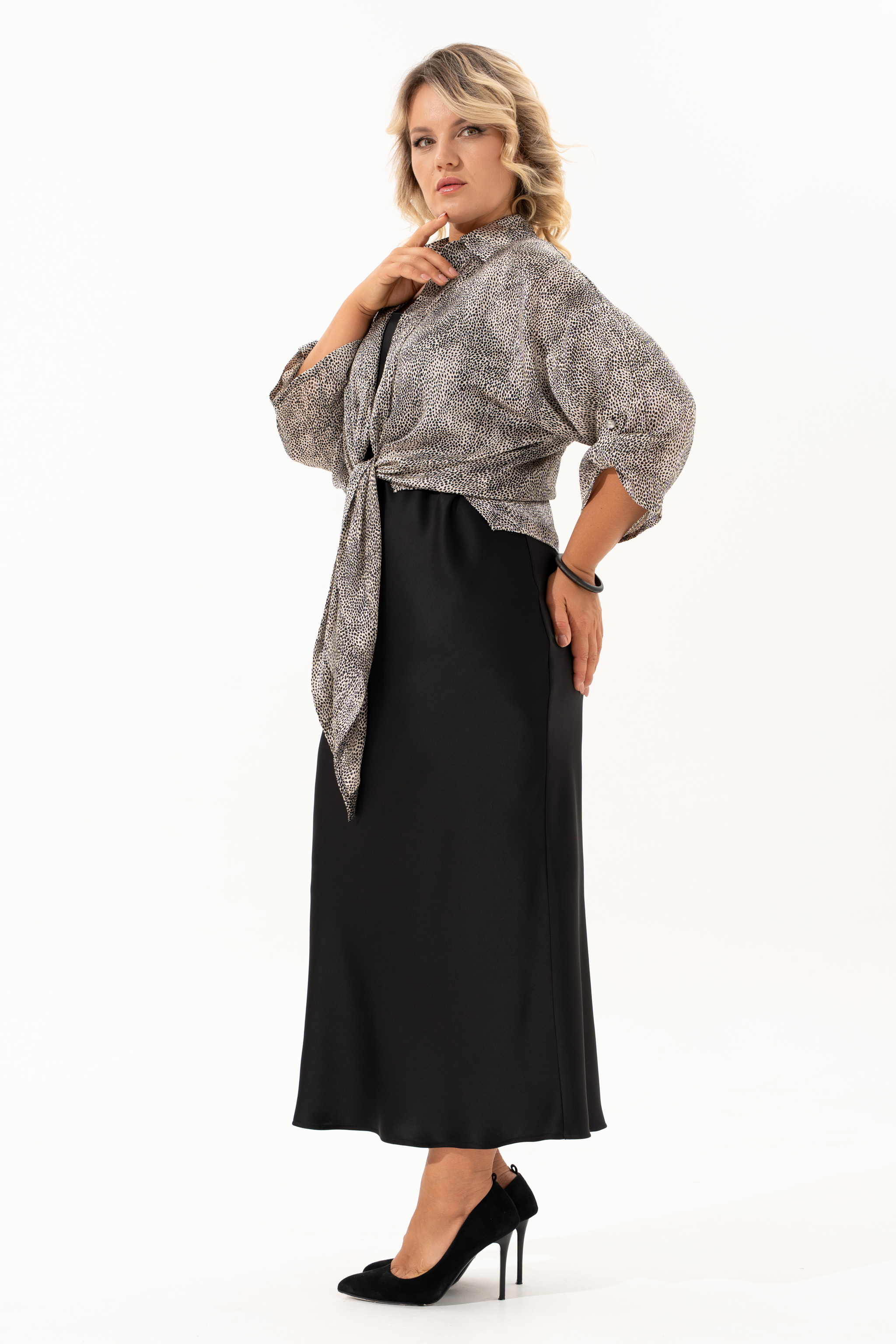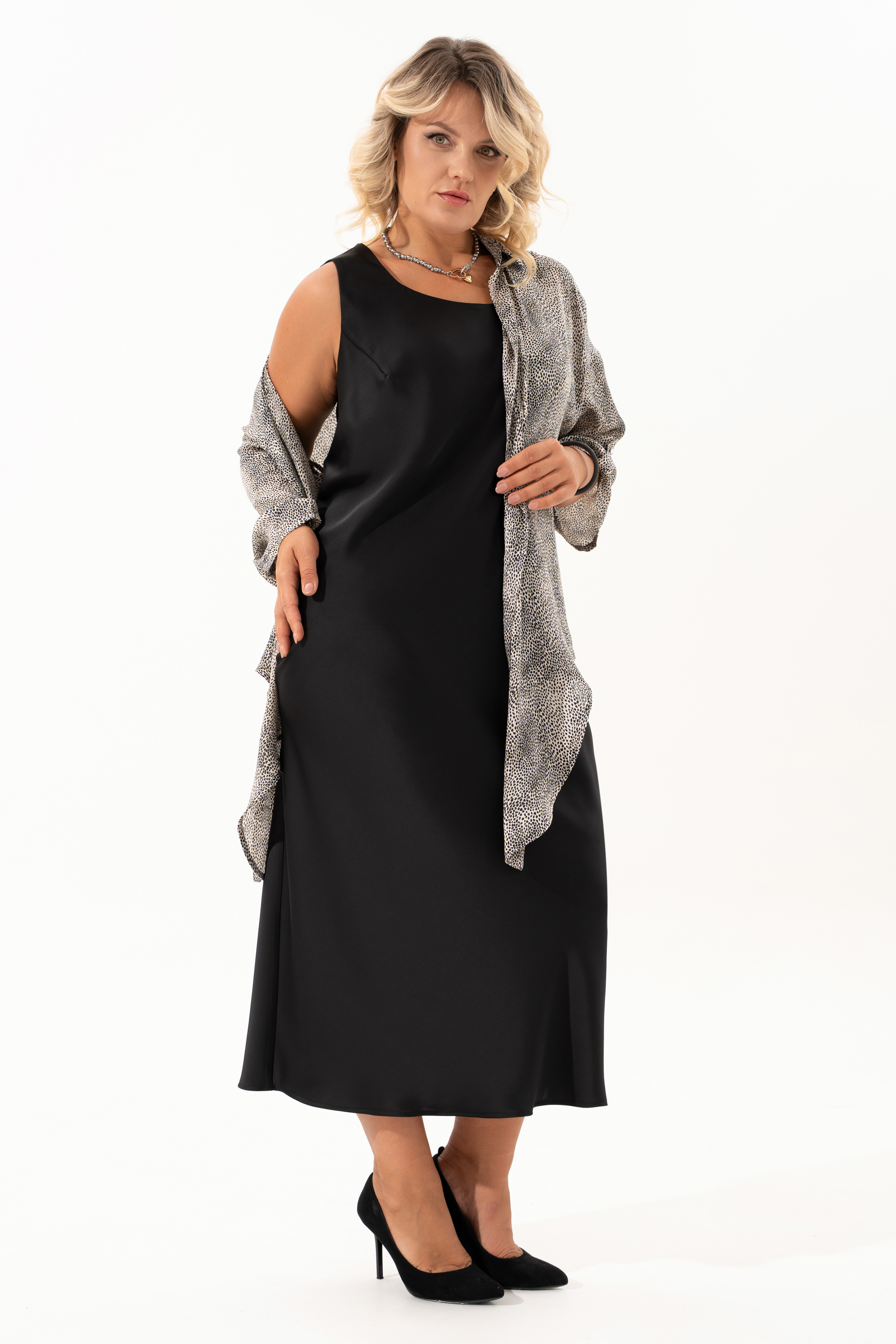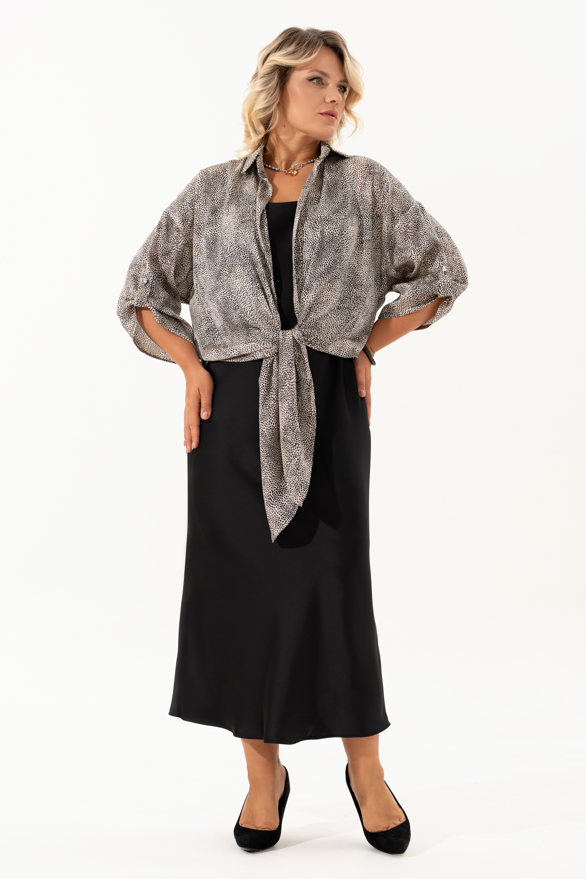 Нарядный двухпредметный комлект, состоящий из рубашки и платья. Рубашка в стиле casual выполнена из принтованной ткани с крэш-эффектом и мелким леопардовым узором — оригинальное сочетание естественной динамики и актуального принта. Модель без застёжек, с воротником на стойке и удлинёнными концами полочек, которые можно элегантно завязать на талии. Рукава длиной 3/4 собраны на паты с декоративной пуговицей, создавая расслабленный и волнующий образ. Второй элемент комплекта — платье из струящегося атласа, кроенное по косой, что обеспечивает красивую посадку и мягкое облегание по фигуре. Углубленная горловина добавляет лёгкой чувственности, а нагрудные вытачки от проймы подчёркивают линию груди. Этот комплект легко адаптируется под разный стиль: носите рубашку отдельно с джинсами, а платье дополните сандалиями и украшениями, подходящими для романтичных прогулок или встреч в городе.