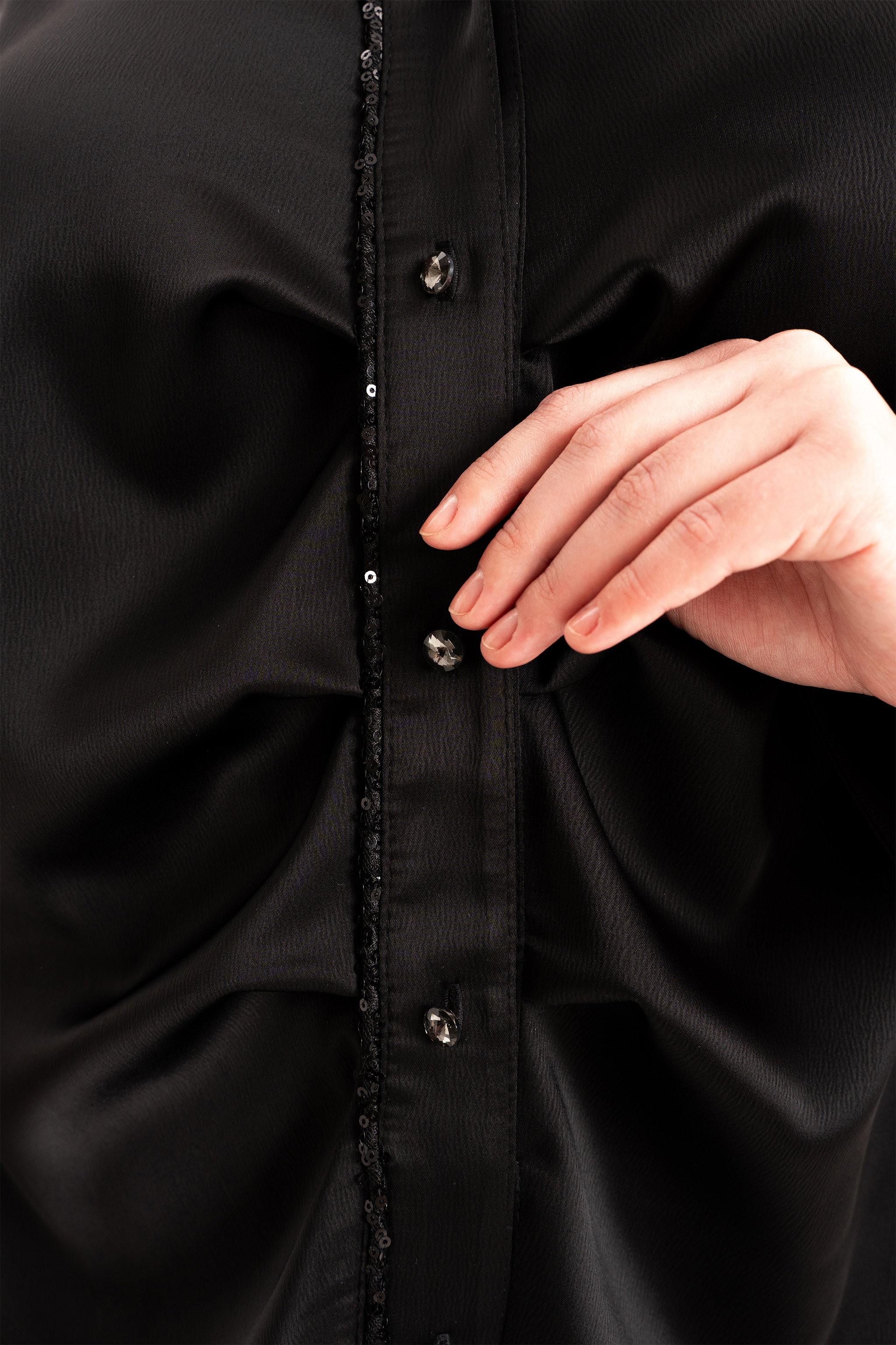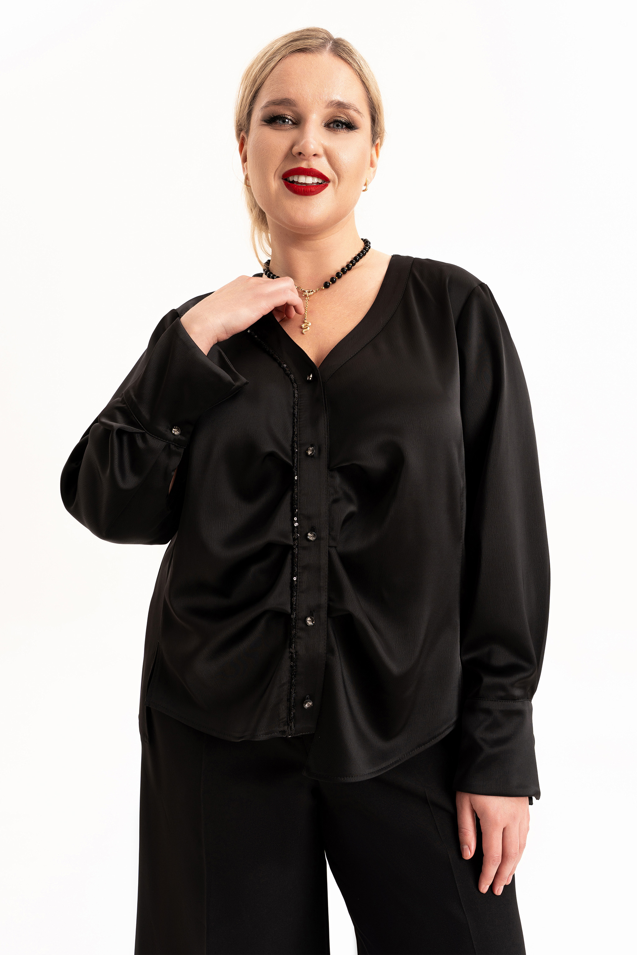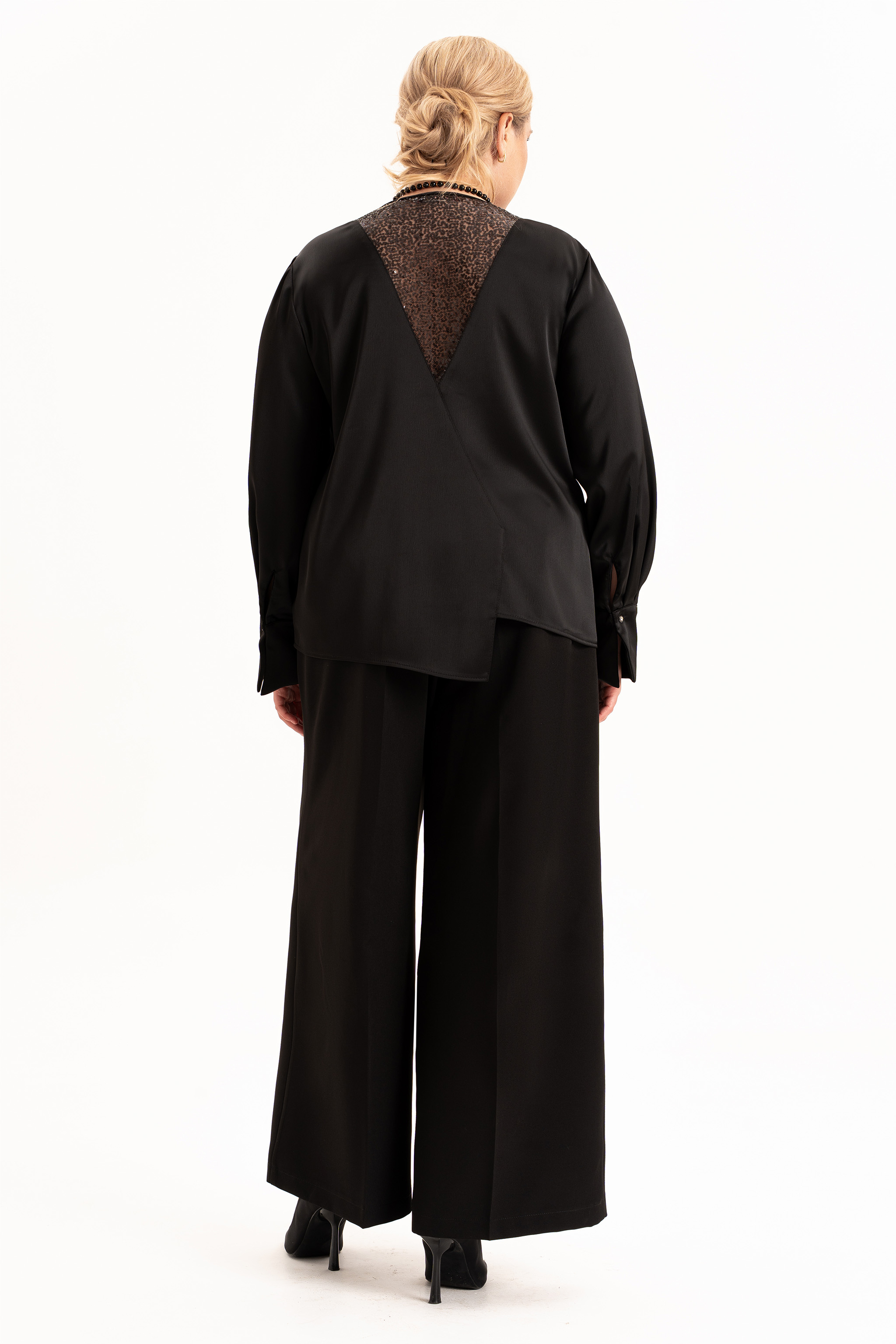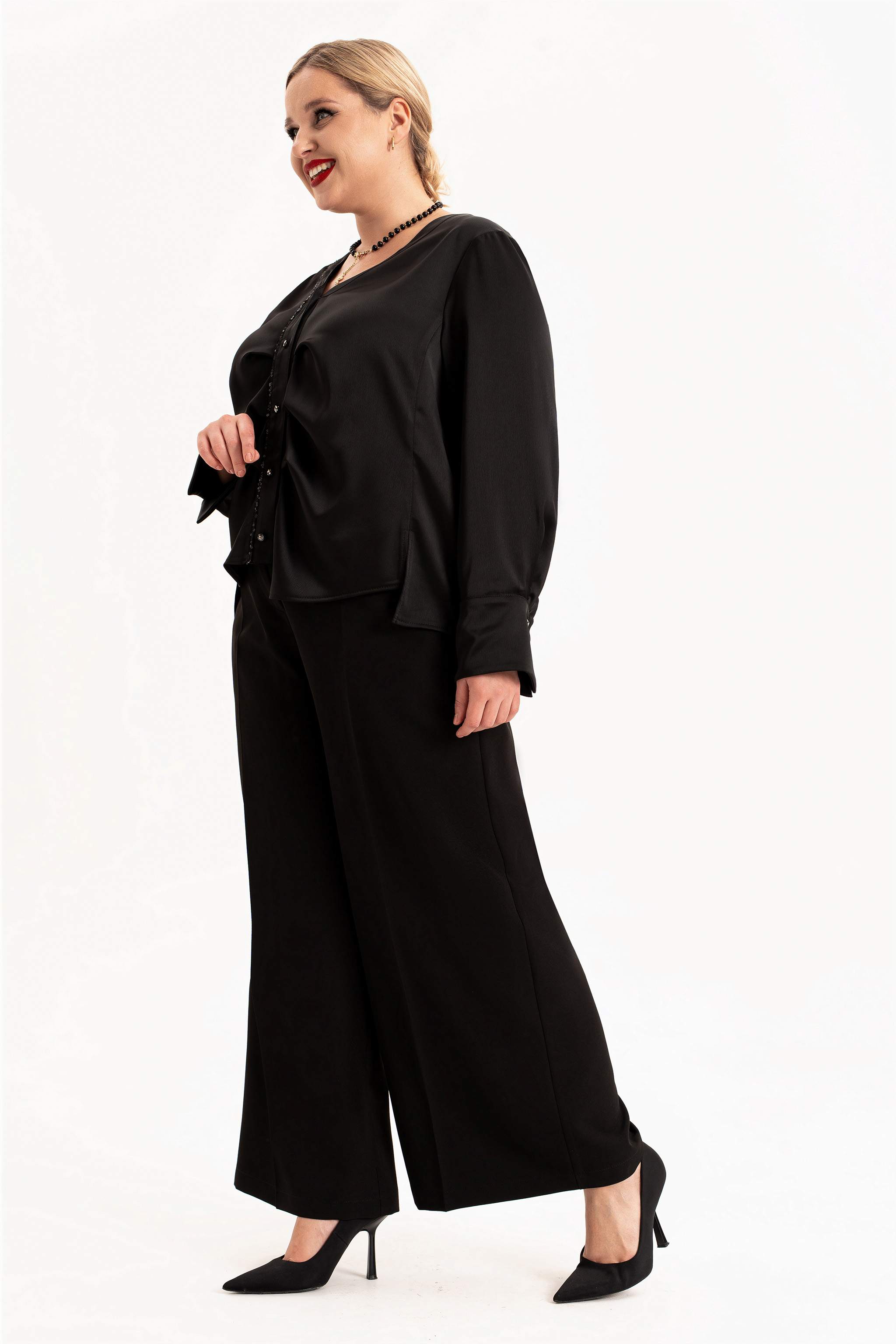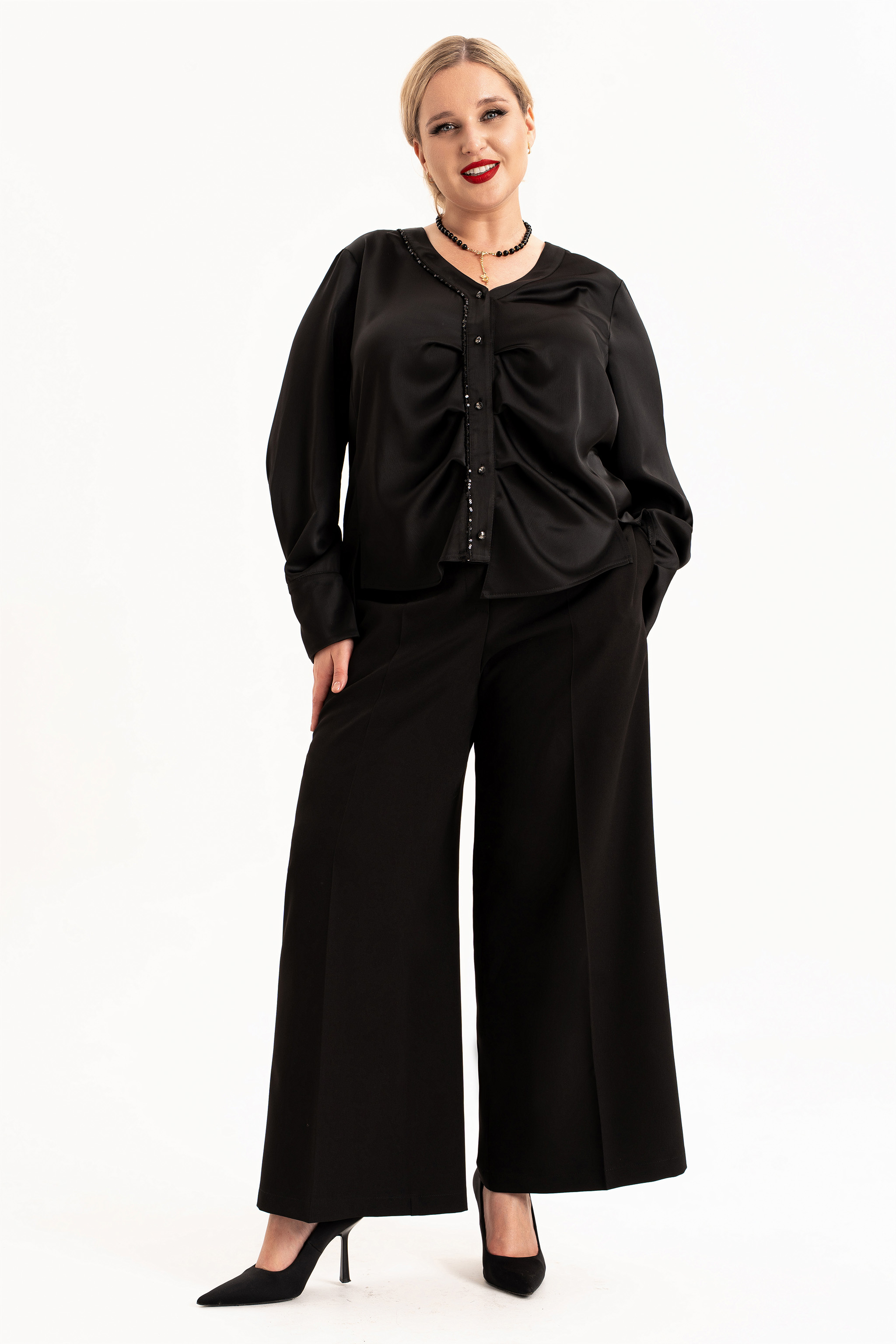 Элегантный женский брючный костюм — настоящая находка для тех, кто ищет идеальный образ на праздник, свадьбу или важный вечер. Классический крой и свободные брюки палаццо подчёркивают достоинства фигуры и дарят комфорт. Нарядный и вечерний стиль — безупречно смотрится на большом мероприятии, создавая образ, полный уверенности и шарма. Блуза выполнена из шелковистой ткани с приятной фактурой. Блузка с длинными струящимися рукавами выглядит очень изящно и очаровательно. Блузка без воротника, застежка на петли и пуговицы по планке, с V – образным вырезом горловины. Спинка с декоративным элементом из паеток. По переду вдоль планок заложены складки и обработан кант из паеток. Изделие асимметрично по низу. Боковые швы перенесены в линию рельфа полочки и спинки. В рельефах полочки обработаны разрезы. Рукав со складкой по шву притачивания манжеты. Прямого силуэта с втачным , длинным рукавом. Брюки с широкими штанинами палаццо выгодно подчеркивают женственные формы, а свободный крой обеспечивает удобство в любой ситуации. На брюках обработаны карманы в боковых швах, по талии пояс с застежкой на молнию и частично на резинке. Красивая двойка строгого силуэта — идеальное сочетание для торжеств и даже для делового офисного дресс кода. Подходит для женщин больших и полных размеров, продуманный крой визуально стройнит, подчёркивает талию и скрывает лишнее. Создайте идеальный образ — выберите стильный женский нарядный костюм с брюками палаццо и подчеркните свою индивидуальность!