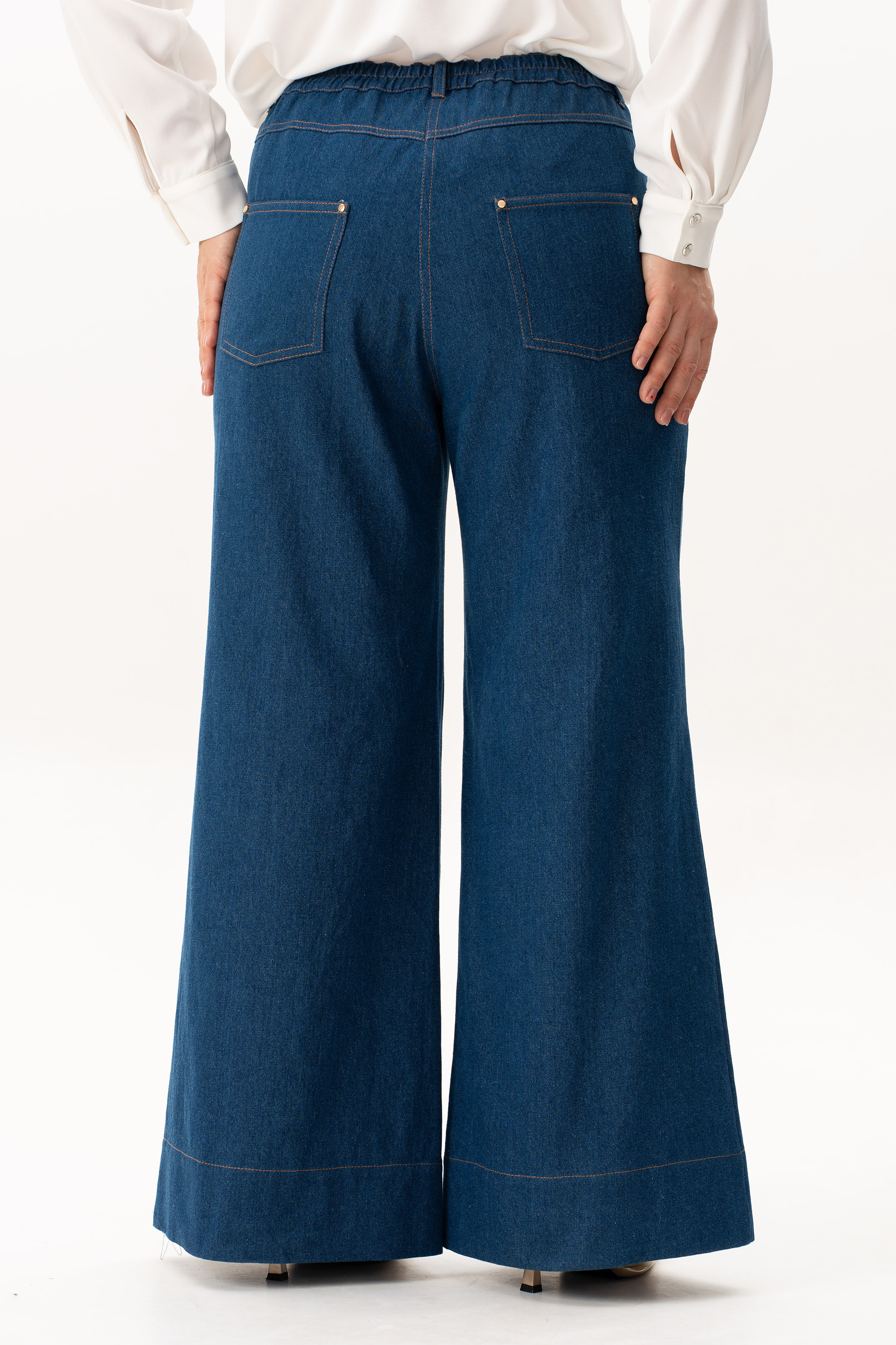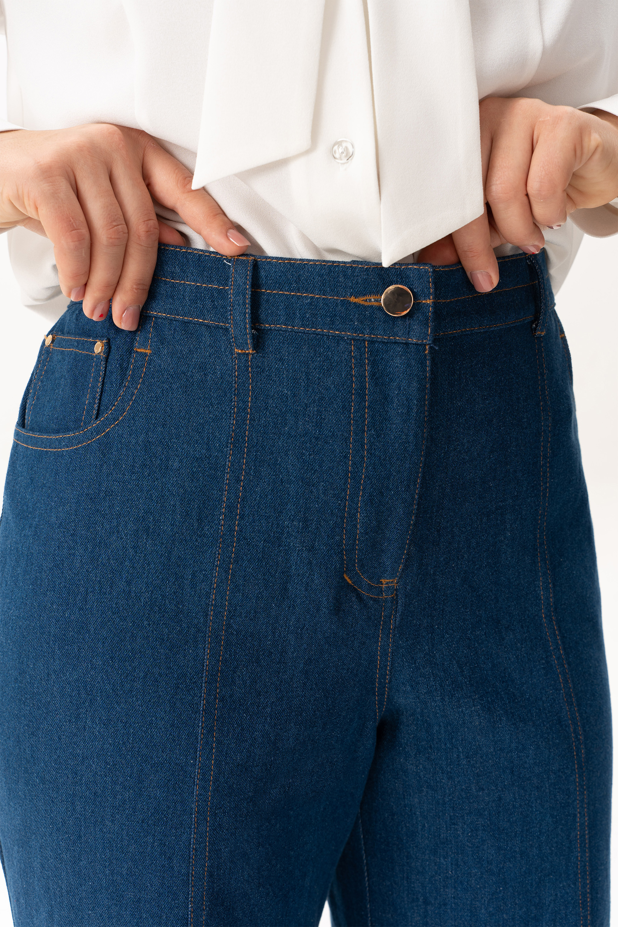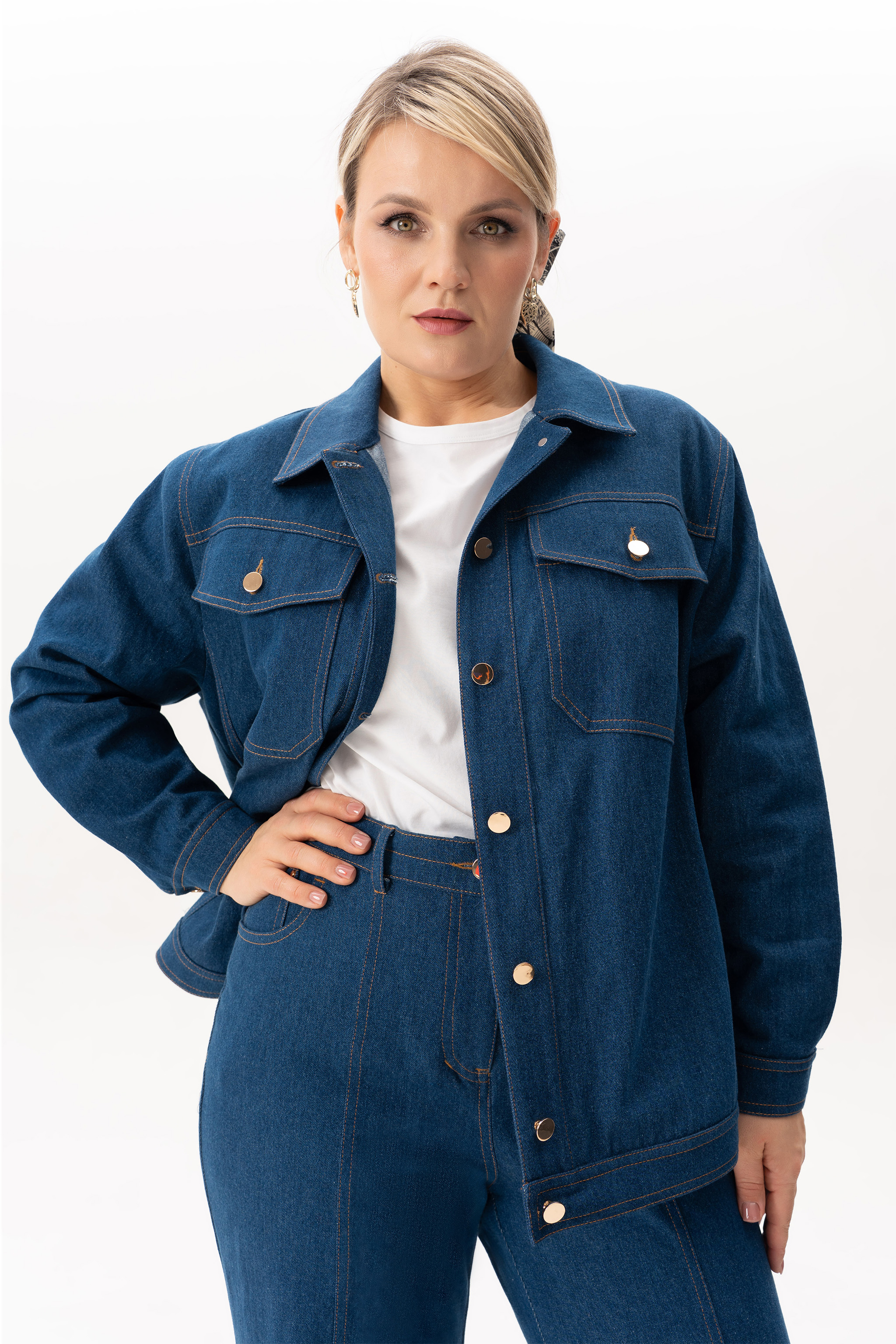 Предлагаем Вам супермодный джинсовый костюм в стиле 70-х — это стильный выбор для современной девушки или женщины. Джинсовый костюм двойка состоит из брюк-клеш и жакета-куртки средней длины на пуговицах, что делает его универсальным выбором. Два накладных нагрудных кармана с клапанами на пуговицах, два боковых кармана в рельефе и 2 внутренних кармана в жакете и пять в брюках добавляют ему функциональности, позволяя всегда иметь под рукой необходимые мелочи. Этот стильный весенний, летний, осенний брючный костюм создан из 100% хлопка, что делает его комфортным при любой температуре и очень приятным к телу. За счет плотной джинсовой ткани, костюм сохраняет свой первоначальный вид на долгое время. Модель с джинсами выполнена в духе классики, но при этом остается актуальной и трендовой на все времена. Возможность носить элементы раздельно — это важное преимущество. Джинсы клеш с высокой посадкой и широкими расклешёнными брючинами от колена. Низ брючин с широким отворотом и контрастной строчкой. Пояс со сшевками, застегивается на петлю и металлическую пуговицу. Вертикальные швы на брючинах визуально удлиняют силуэт. Мягкая эластичная резинка в поясе брюк обеспечивает комфортную посадку без стеснения движений, адаптируется к особенностям фигуры и не создаёт давления на талию, позволяя носить костюм целый день с лёгкостью. Джинсы с завышенной талией станут универсальным элементом гардероба как на каждый день, так и на праздничное мероприятие. Куртка-жакет легко комбинируется с другими элементами гардероба, сохраняя при этом классический образ. Если добавить парочку модных аксессуаров, то костюм легко трансформируется в наряд для вечеринки, дня рождения или другого значимого торжества. Не упустите возможность сделать заказ костюма прямо сейчас и приковывать к себе все взгляды окружающих уже сегодня!