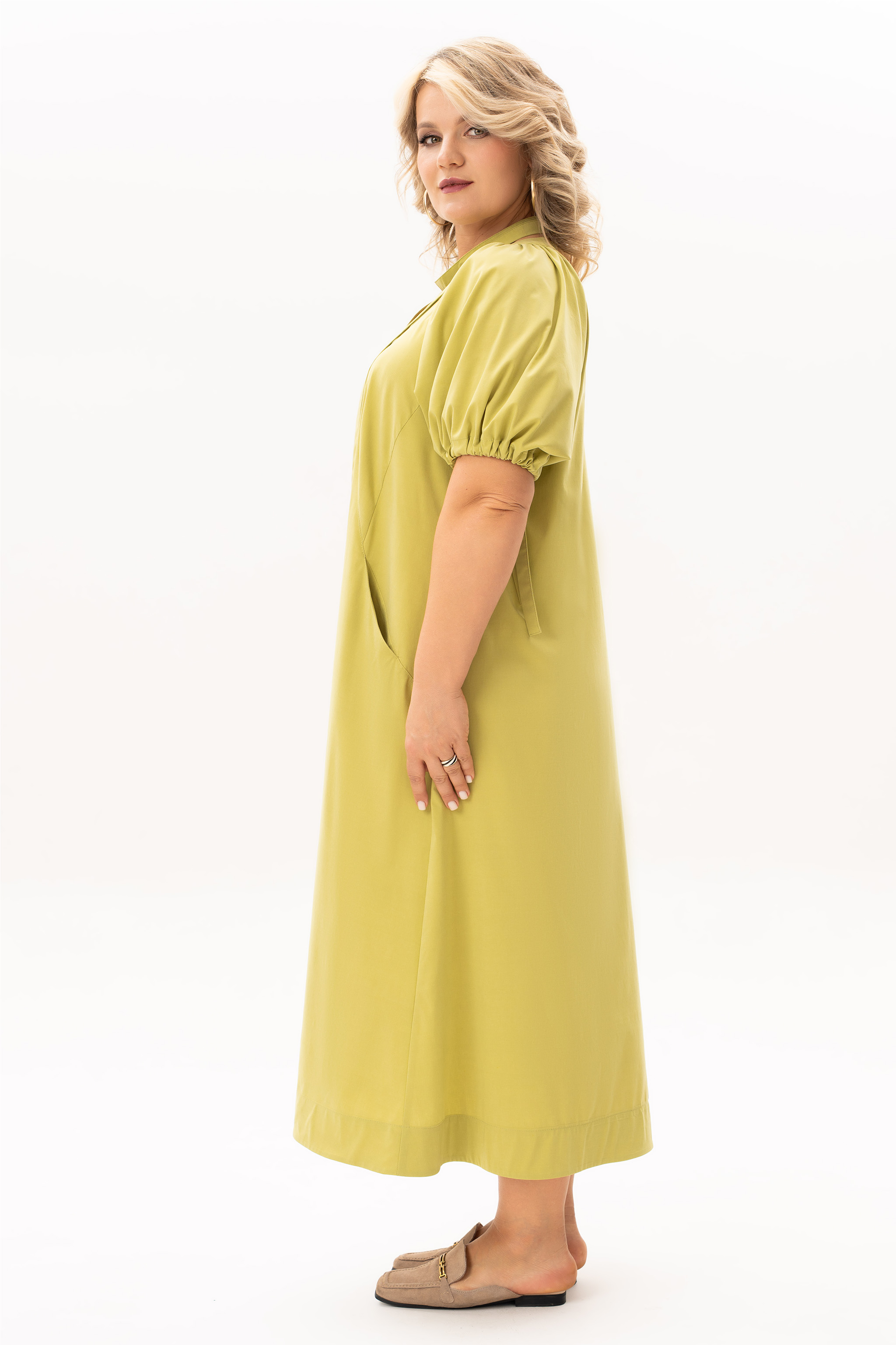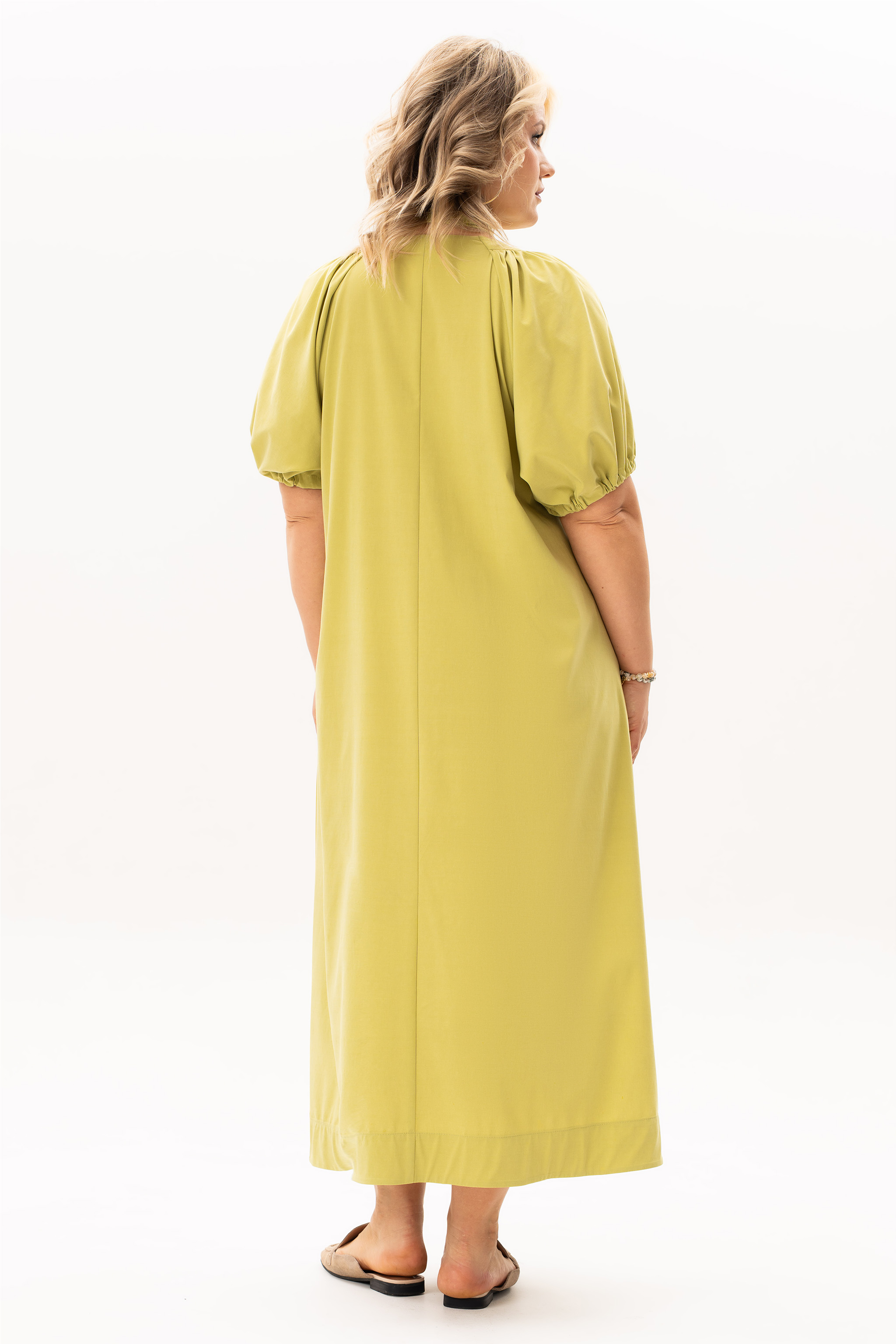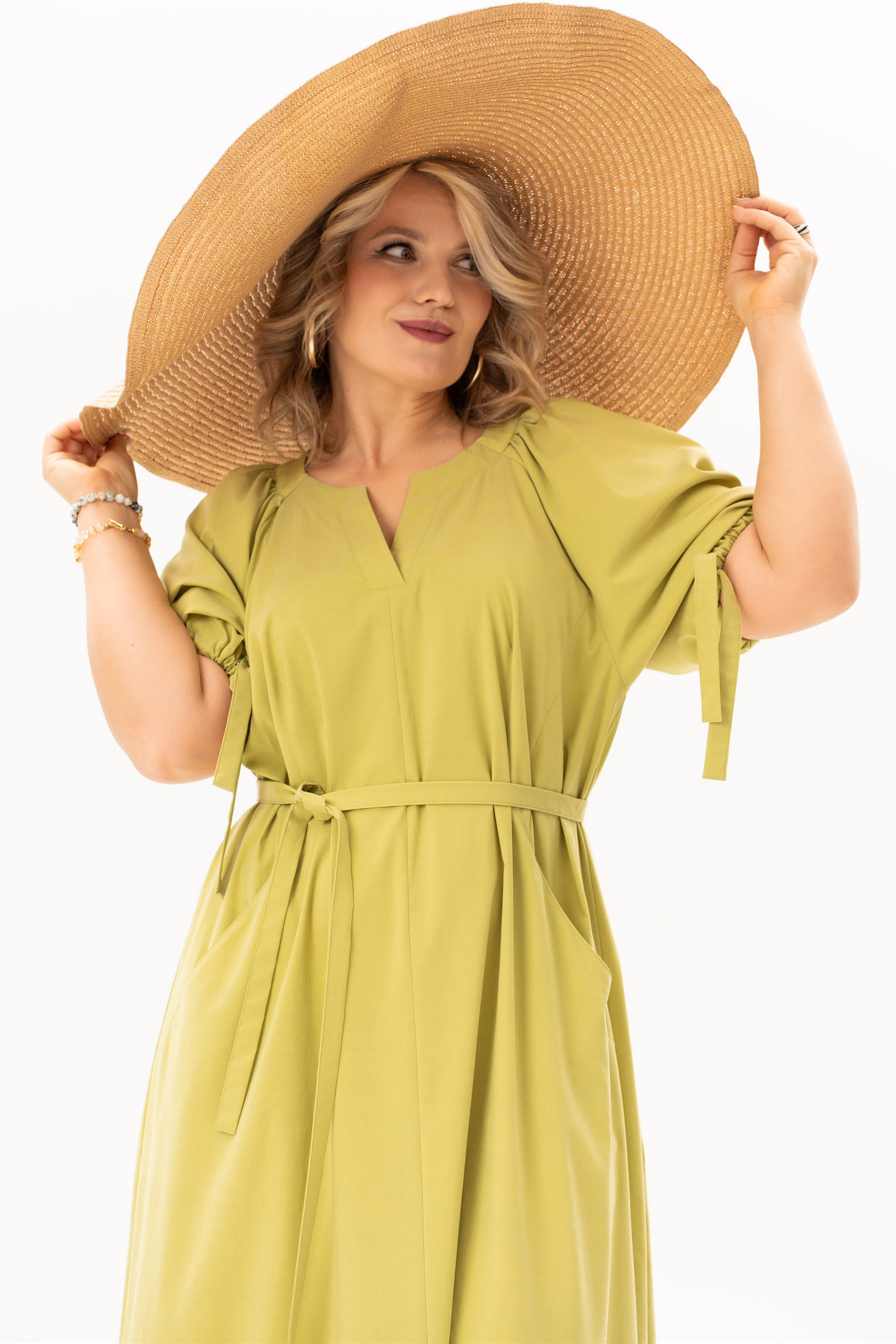 Это летнее платье — идеальное воплощение легкости и современного стиля. Вот подробное описание модели, как на фото: Летнее платье миди в цвете лайм . Силуэт и крой: Платье имеет свободный А-образный крой, который обеспечивает комфорт в жаркую погоду. Длина миди (до середины голени) делает образ элегантным и подходящим для разных случаев. Акцент на талии: в комплекте съемный пояс-завязка из той же ткани. Он позволяет трансформировать образ: можно подчеркнуть фигуру, создав женственный силуэт, или носить платье без него как свободную тунику (оверсайз). Детали лифа: V-образный вырез горловины визуально удлиняет шею. Деликатная сборка у воротника добавляет ткани красивую драпировку. Рукава: Объемные рукава длиной до локтя дополнены кулисками с завязками. Это позволяет регулировать длину и пышность рукава, создавая эффектные «фонарики». Ткань: Материал выглядит натуральным и легким (вероятно, смесовый хлопок или лен), что позволяет коже «дышать». Сочный оливково-лаймовый оттенок идеально подчеркивает летний загар.